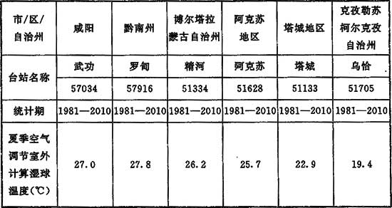 本附錄提供了我國除香港、澳門特別行政區(qū),臺灣外28個省級行政區(qū)、4個直轄市所屬294個臺站的室外空氣計算參數(shù)。由于臺站遷移、觀測條件不足等因素,個別臺站的基礎(chǔ)數(shù)據(jù)缺失,統(tǒng)計年限不足30年。統(tǒng)計年限不足30年的計算結(jié)果在使用時應(yīng)參照鄰近臺站數(shù)據(jù)進行比較、修正。咸陽、黔南州及新疆塔城地區(qū)等個別臺站的濕球溫度無記錄,可參考表15的數(shù)值選取。