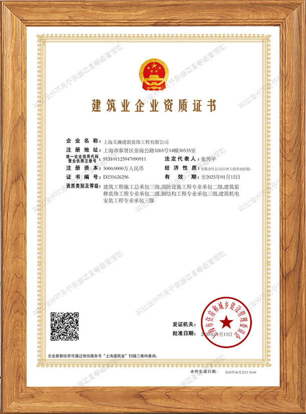 上海天瀾建筑裝飾工程有限公司由熱愛(ài)裝修事業(yè)的專(zhuān)業(yè)人士創(chuàng)辦,經(jīng)上海工商行政管理局注冊(cè)登記的專(zhuān)業(yè)上海工裝公司。天瀾建筑裝飾注冊(cè)資本5000萬(wàn),擁有建筑施工總承包三級(jí),鋼結(jié)構(gòu)工程專(zhuān)業(yè)承包三級(jí)建筑裝飾工程專(zhuān)業(yè)承包二級(jí),建筑機(jī)電設(shè)備安裝專(zhuān)業(yè)承包三級(jí),消防設(shè)施工程專(zhuān)業(yè)承包二級(jí)等資質(zhì)。國(guó)家建筑裝飾裝修工程設(shè)計(jì)與施工二級(jí)資質(zhì)單位、上海市建筑裝飾裝修行業(yè)協(xié)會(huì)會(huì)員單位、有上海市建設(shè)和交通委員會(huì)頒發(fā)的“安全生產(chǎn)許可證”。
