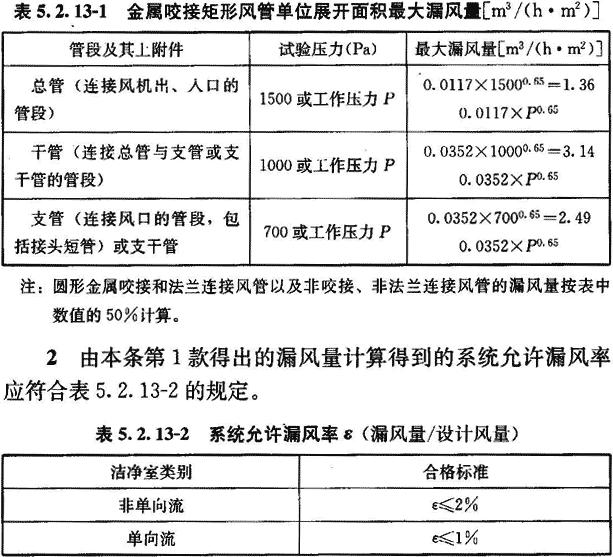 5.2.13 咬接和法蘭連接的金屬風(fēng)管,應(yīng)在膠封縫隙以后和絕熱之前,按附錄A的方法進(jìn)行分段漏風(fēng)檢測(cè)或按現(xiàn)行國家標(biāo)準(zhǔn)《通風(fēng)與空調(diào)工程施工質(zhì)量驗(yàn)收規(guī)范》GB 50243的方法進(jìn)行干管和主管系統(tǒng)的漏風(fēng)檢測(cè)。1~5級(jí)潔凈度環(huán)境的風(fēng)管應(yīng)全部進(jìn)行漏風(fēng)檢測(cè),6~9級(jí)潔凈度環(huán)境的風(fēng)管應(yīng)對(duì)30%的風(fēng)管并不少于1個(gè)系統(tǒng)進(jìn)行漏風(fēng)檢測(cè)。檢測(cè)結(jié)果應(yīng)同時(shí)符合下列兩項(xiàng)嚴(yán)密性指標(biāo):