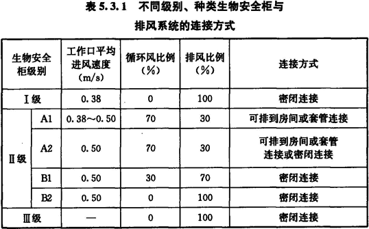 4 不同級(jí)別、種類生物安全柜與排風(fēng)系統(tǒng)的連接方式應(yīng)按表5.3.1選用。